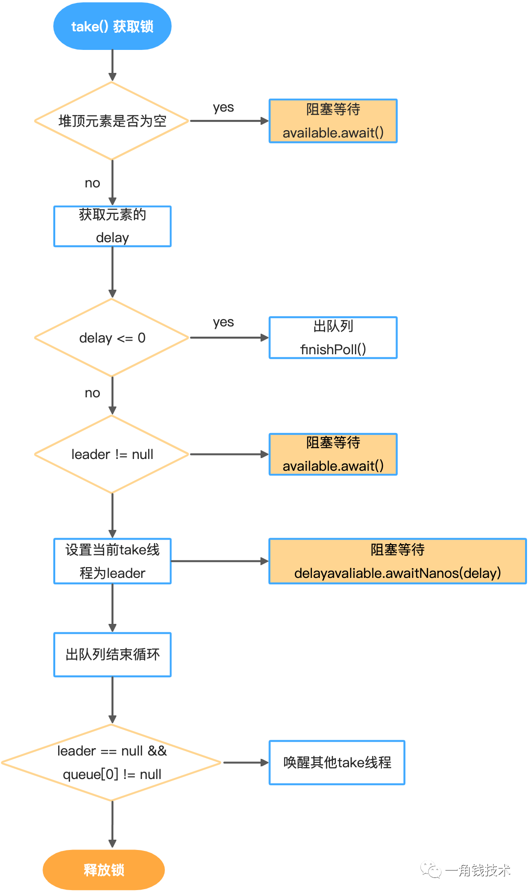 DelayedWorkQueue的数据结构是基于堆实现的; DelayedWorkQueue采用数组实现堆,根节点出队,用最后叶子节点替换,然后下推至满足堆成立条件;最后叶子节点入队,然后向上推至满足堆成立条件; DelayedWorkQueue添加元素满了之后会自动扩容原来容量的1/2,即永远不会阻塞,最大扩容可达Integer.MAX_VALUE,所以线程池中至多有corePoolSize个工作线程正在运行; DelayedWorkQueue 消费元素take,在堆顶元素为空和delay >0 时,阻塞等待; DelayedWorkQueue 是一个生产永远不会阻塞,消费可以阻塞的生产者消费者模式; DelayedWorkQueue 有一个leader线程的变量,是Leader-Follower模式的变种。当一个take线程变成leader线程时,只需要等待下一次的延迟时间,而不是leader线程的其他take线程则需要等leader线程出队列了才唤醒其他take线程。