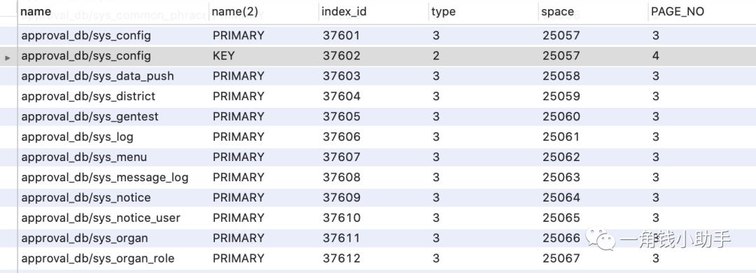 可以看出数据库approval_db下的sys_config表、sys_config表主键索引根页的page number均为3,而其他的二级索引page number为4。