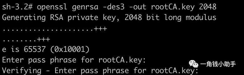 创建rootCA.key(命令:openssl genrsa -des3 -out rootCA.key 2048)。