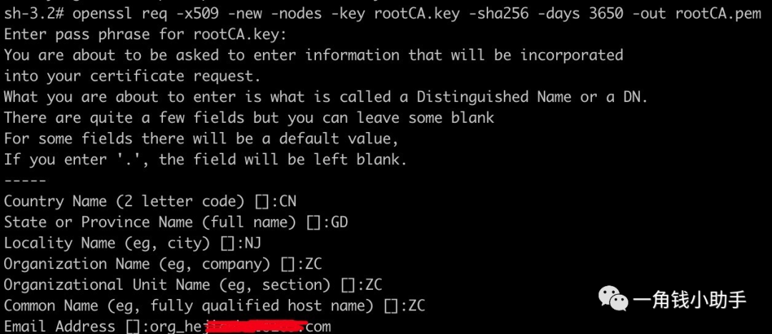 创建时需要输入rootCA.key的密码。 其他信息可以随意填写。