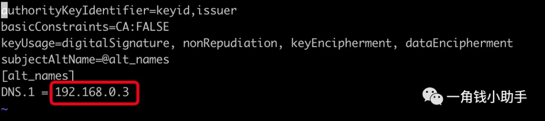 将下列文字复制粘贴进去 注意最后一行,(DNS.1 = xxxxxxx) 这一行可以输入域名或IP。