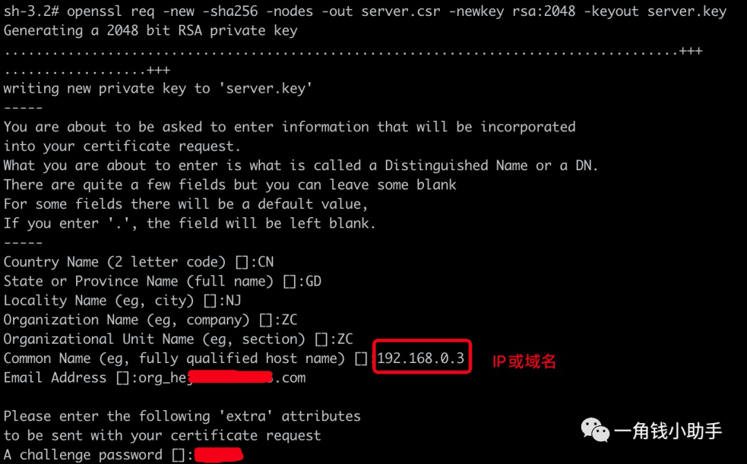 创建server.csr和server.key(命令:openssl req -new -sha256 -nodes -out server.csr -newkey rsa:2048 -keyout server.key)