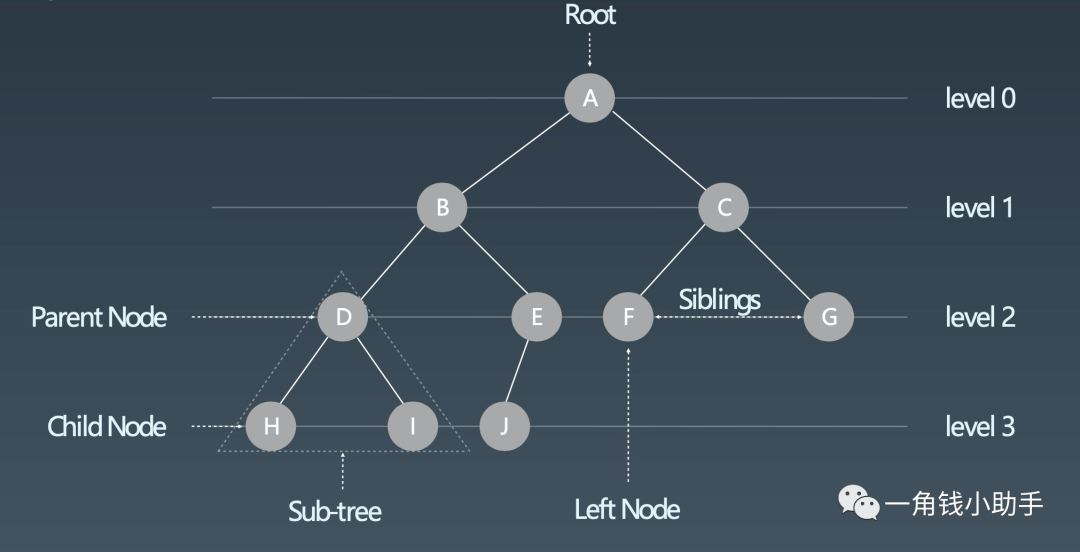 这个结点,也就是根节点,它的左子树高度是 3,右子树高度是 4,所以它的平衡因子就是右子树高度 4 减去左子树高度 3,所以它就是正 1。另外 F