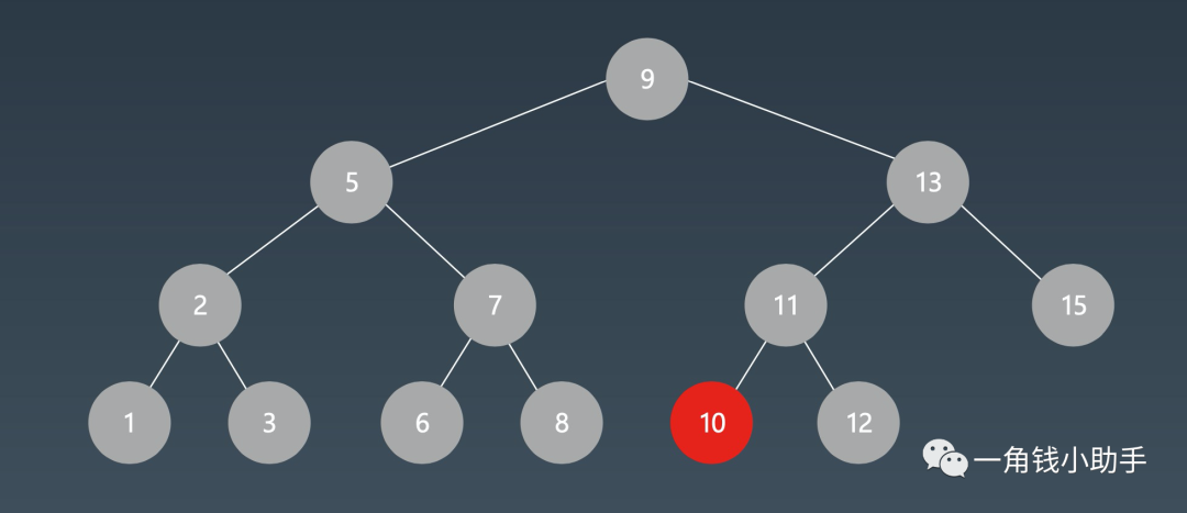 如何查找结点假设我们要查找 10,首先来和根相比,如果是小于 9 的话,只要去左子树就行了,10 是大于 9 的,那就去右子树,10 是小于 13 的就去左子树,10 是小于 11 的再去左子树就找到 10 了,而找不到的话也就是找不到。这时候你会发现查找的时间复杂度就是这个树的深度。如何这个树本身有 n 层的话,那么它的时间复杂度是 n,但是一般我们定义 n 为树的总的结点个数,这个时候它的时间复杂度平均来说就是 log2n,这里的 n 表示树里面总的结点个数。