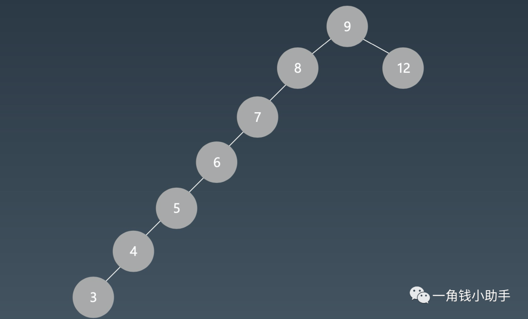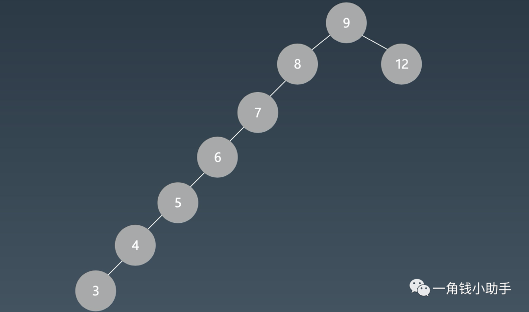 但一般来说,我们不会等到在真正的自平衡二叉树里面(AVL 和红黑树里面),不会等到这个树以及病入膏肓了,就是已经变成很极端的这根棍子的时候,再去平衡。而是在每一步进行插入或者删除操作的时候,都去判断它是否平衡,以及将它维护成平衡二叉树的状态。