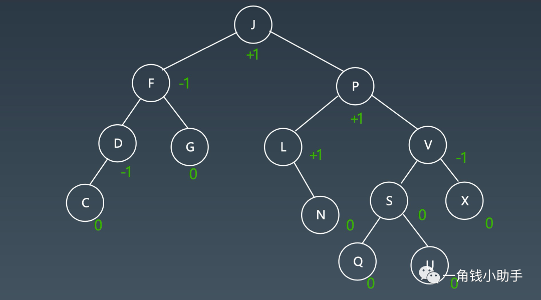 这个结点,右子树高度是 1,左边子树高度是 2,1 减去 2 就是-1。G