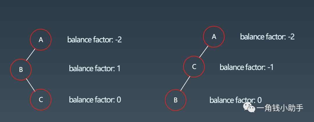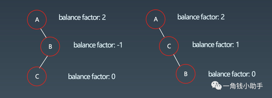 这种情况就是说它是先左子树再右子树,A 这里的平衡因子变成了-2,基于这种先左子树再右子树的情况的话,我们就叫做左右子树型。左右子树型就要左右旋转。