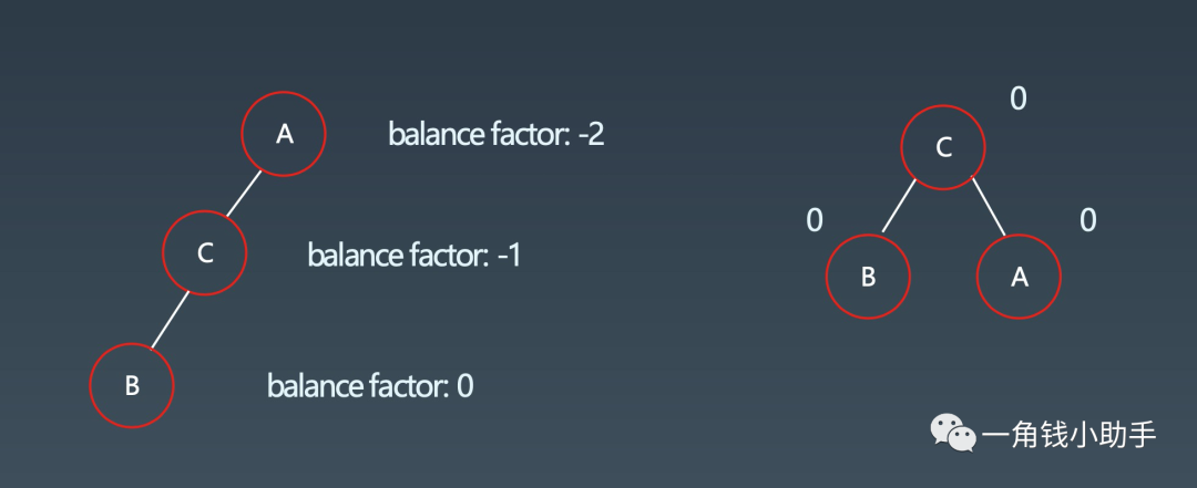 右左子树的情况,先是一次右旋,注意这里的 C 是小于 B 的,所以把它右旋上去的话,C 顶上去 B 就拉下来,这样子还是满足二叉搜索树的性质。