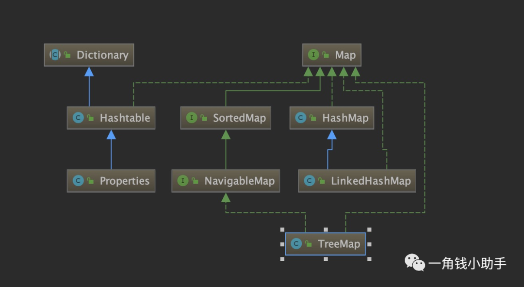 从上图看 TreeMap 继承并实现了Map,那么TreeMap 肯定也具有和 Map 一样执行 put、get 的操作,直接通过 key 获取 value 值。同时实现了 SortedMap