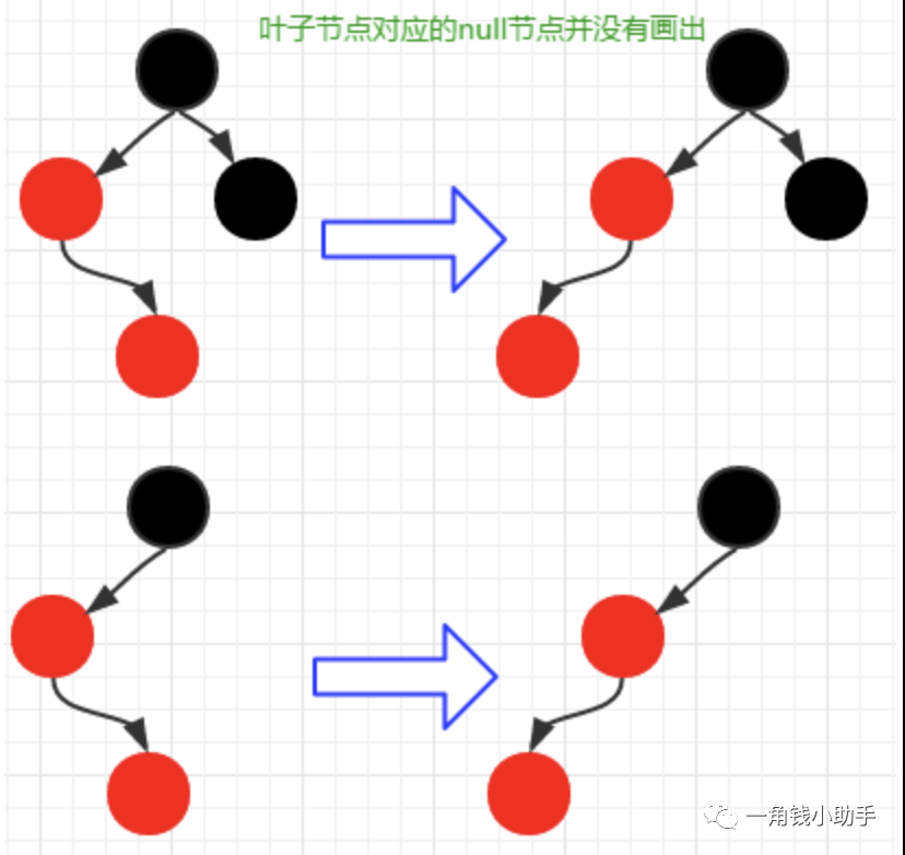 情况1: 被删除的节点为根节点或者颜色为红色,此时删除节点不影响红黑树的特点,无需操作。