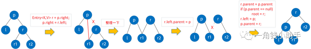 变色:在不违法上述红黑树规则特点情况下,将红黑树某个 node 节点颜色由红变黑,或者由黑变红; 左旋:逆时针旋转两个节点,让一个节点被其右子节点取代,而该节点成为右子节点的左子节点; 右旋:顺时针两个节点,让一个节点被其左子节点取代,而该节点成为左子节点的右子节点。