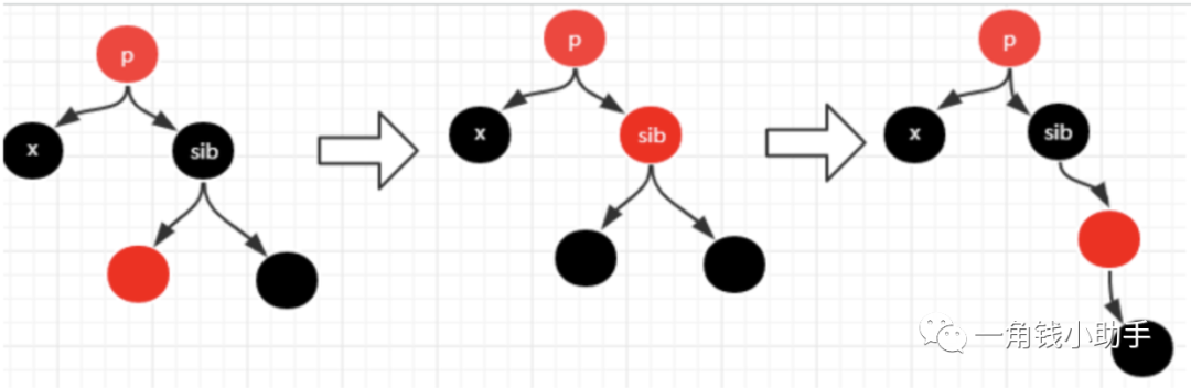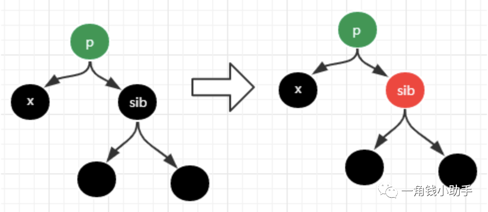 * 左子节点为黑色,此时需要将sib节点的颜色设置成和x的父节点p相同的颜色,
