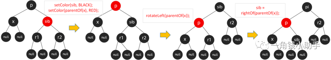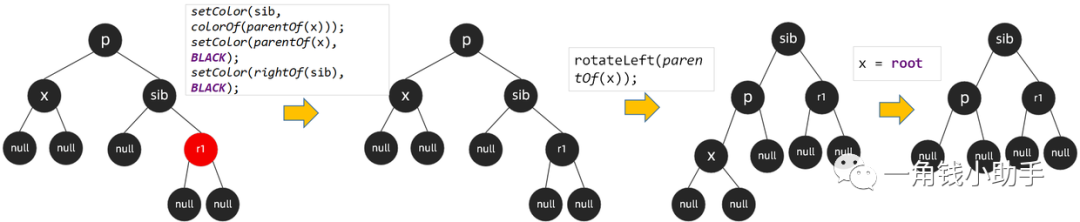 * 设置x的父节点为黑色,设置sib右子节点为黑色,左旋x的父节点p,然后将x赋值为root
