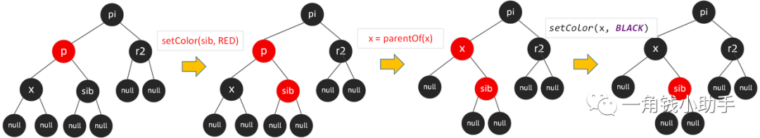 场景2:节点x,x的兄弟节点sib、sib的左子节点和右子节点都为黑色时,需要将该节点sib由黑变红,同时将x指向当前x的父节点。