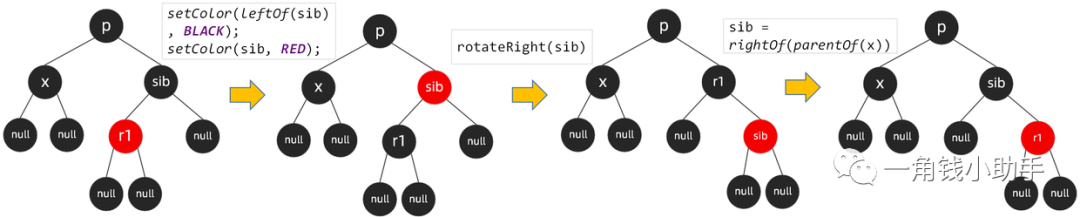 * 需要将sib左子节点设置为黑色,sib节点设置为红色,同时按sib右旋,再将sib指向x的
