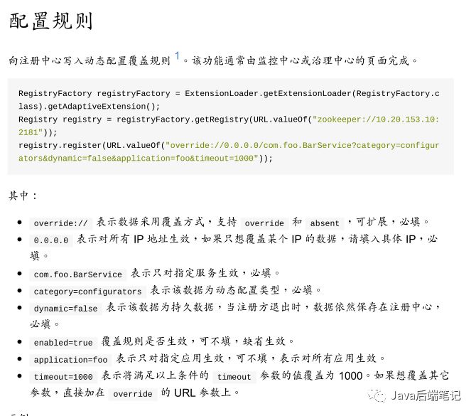 override的原理是,其实在RegistryProtocol使用export方法对服务进行本地暴露以及注册Provider Url到zk后,还做了另外一个操作,监听服务对应的 /dubbo/interface/configurations目录,一旦configurations目录下节点发生变化,就会重新生成暴露的url,然后进行reexport。 具体相关源码大家可以细细品味下,我觉得这个设计是dubbo服务治理的核心。 注册监听代码如下