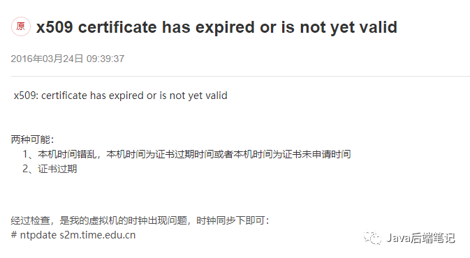 但是从我现在解决了这个问题之后来推断,Host和docker container内只相差了8个小时,主要还是由于证书过期引起
