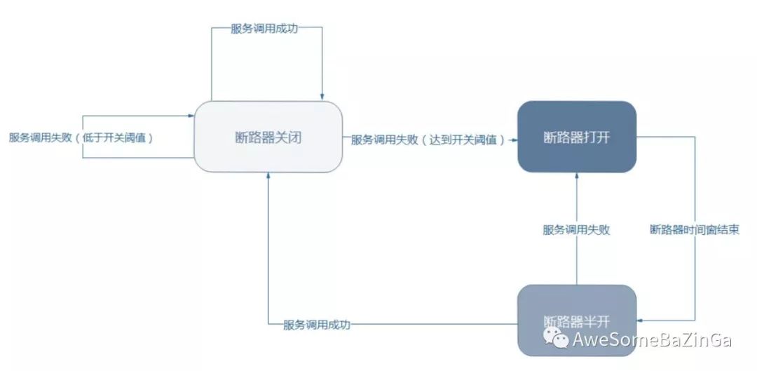 软件世界的断路器可以这样理解:实时监测应用,如果发现在一定时间内失败次数/失败率达到一定阈值,就“跳闸”,断路器打开——此时,请求直接返回,而不去调用原本调用的逻辑。