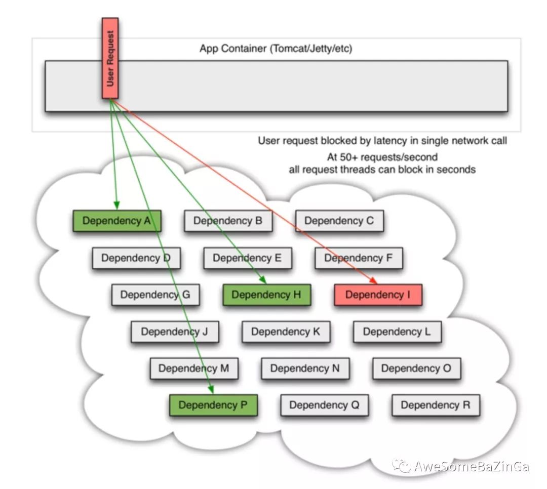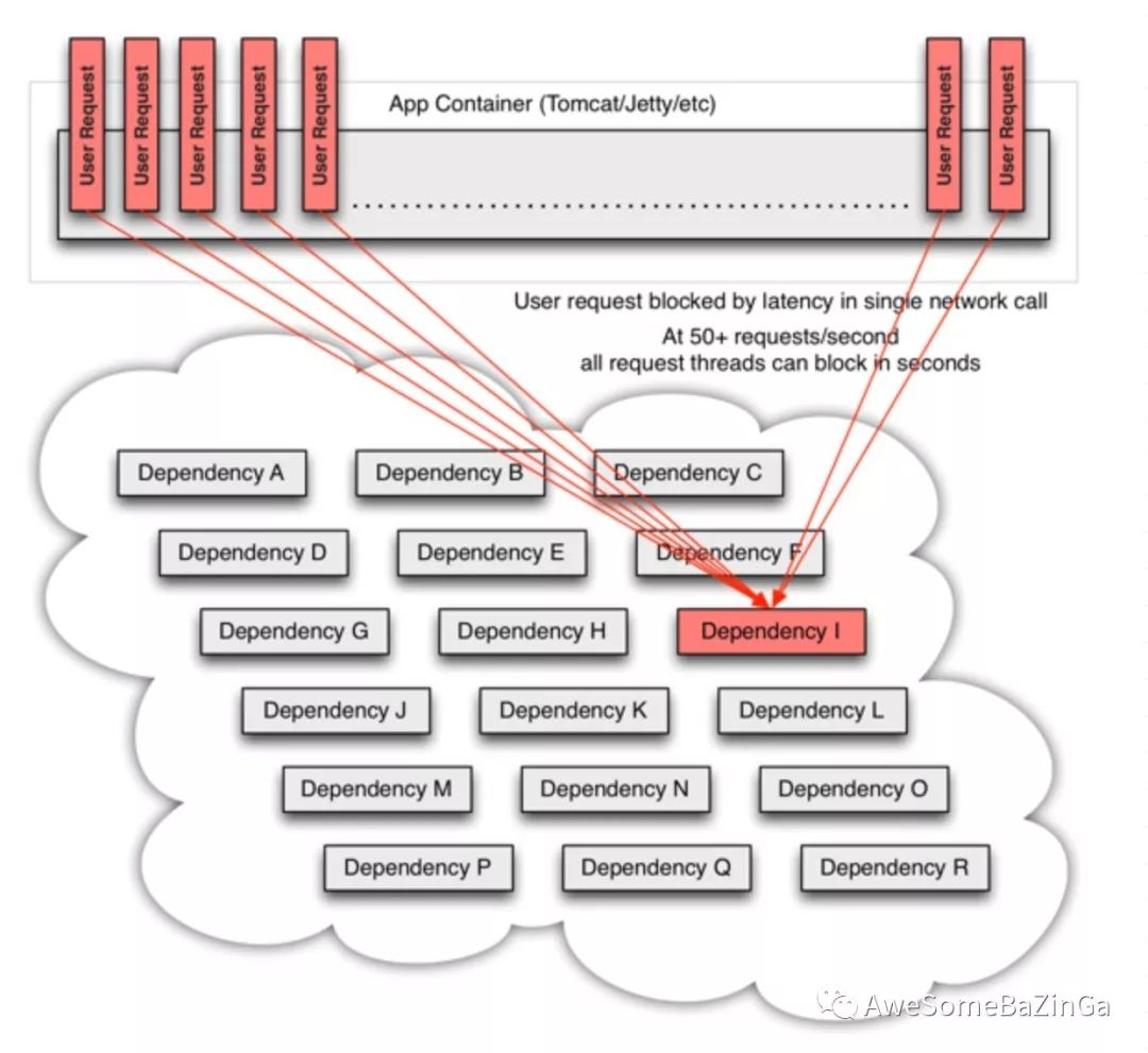 在高流量的情况下,一个后端依赖项的延迟可能导致所有服务器上的所有资源在数秒内饱和(PS:意味着后续再有请求将无法立即提供服务)