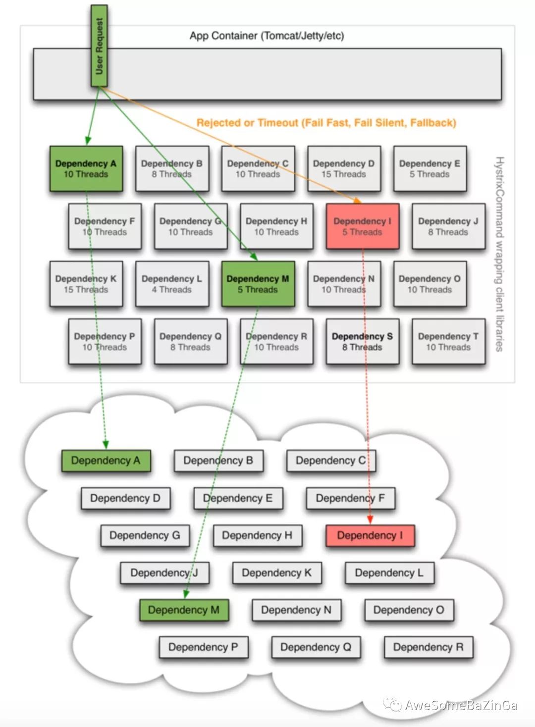 当你使用Hystrix来包装每个依赖项时,上图中所示的架构会发生变化,如下图所示,每个依赖项相互隔离,当延迟发生时,它会被限制在资源中,并包含回退逻辑,该逻辑决定在依赖项中发生任何类型的故障时应作出何种响应: