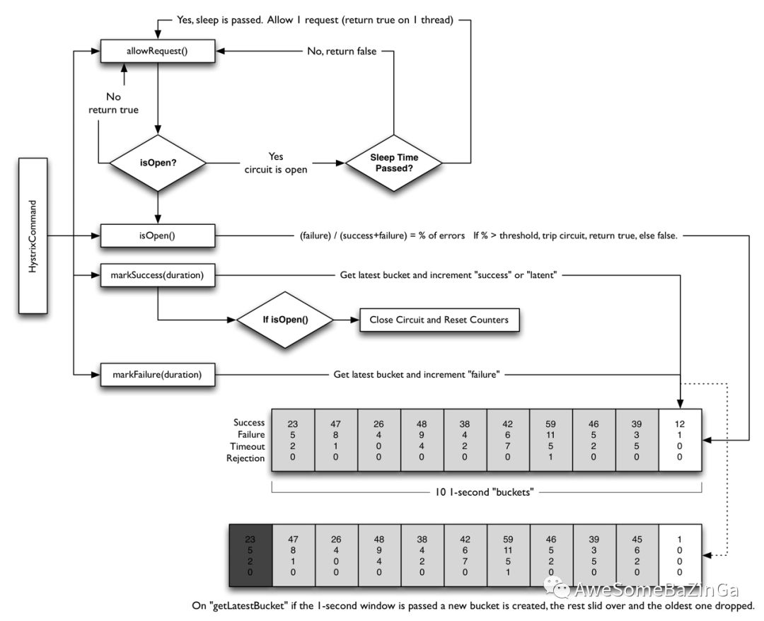 1.假设电路上的音量达到一定阈值(HystrixCommandProperties.circuitBreakerRequestVolumeThreshold),默认是5秒20次。2.并假设错误百分比超过阈值错误百分比(HystrixCommandProperties.circuitBreakerErrorThresholdPercentage),默认是50%。3.然后断路器从CLOSED转换到OPEN。4.它是开放的,它使所有针对该断路器的请求短路。5.经过一段时间(HystrixCommandProperties.circuitBreakerSleepWindowInMilliseconds),下一个单个请求是通过(这是HALF-OPEN状态)。如果请求失败,断路器将在睡眠窗口持续时间内返回到OPEN状态。如果请求成功,断路器将转换到CLOSED,逻辑1.重新接管。