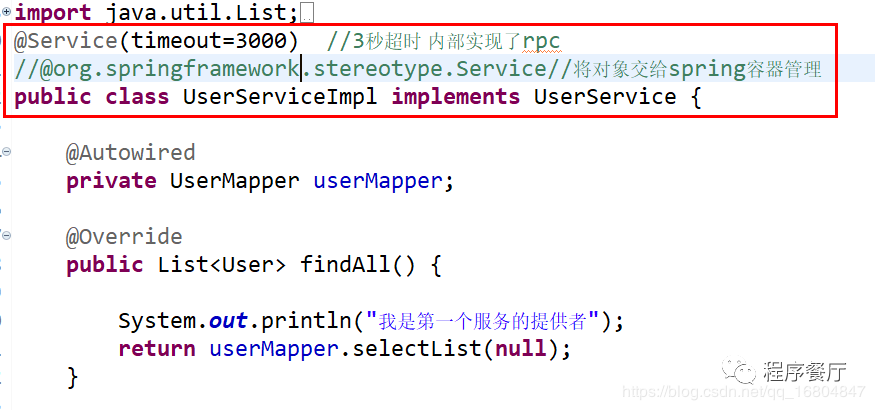 @RestControllerpublic class UserController {//利用dubbo的方式为接口创建代理对象 利用rpc调用@Reference //(loadbalance="leastactive")//@Autowired //只能注入spring家的对象private UserService userService;/*** Dubbo框架调用特点:远程RPC调用就像调用自己本地服务一样简单* @return*/@RequestMapping("/findAll")public List<User> findAll(){//远程调用时传递的对象数据必须序列化.return userService.findAll(); //rpc调用}@RequestMapping("/saveUser/{name}/{age}/{sex}")public String saveUser(User user) {userService.saveUser(user);return "用户入库成功!!!";}}