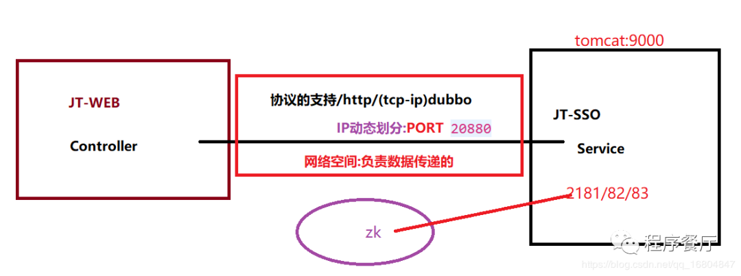 #关于Dubbo配置dubbo:scan:basePackages: com.jt #指定dubbo的包路径application: #应用名称name: provider-user #一个接口对应一个服务名称registry:address: zookeeper://192.168.126.129:2181?backup=192.168.126.129:2182,192.168.126.129:2183protocol: #指定协议name: dubbo #使用dubbo协议(tcp-ip) web-controller直接调用sso-Serviceport: 20880 #每一个服务都有自己特定的端口 不能重复.