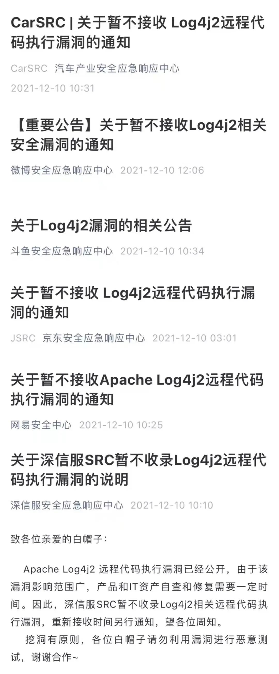 随着漏洞爆出,各家大厂纷纷发布公告,斗鱼、京东、网易、深信服和汽车产业安全应急响应中心皆发文表示,鉴于该漏洞影响范围比较大,业务自查及升级修复需要一定时间,暂不接收 Log4j2 相关的远程代码执行漏洞。
