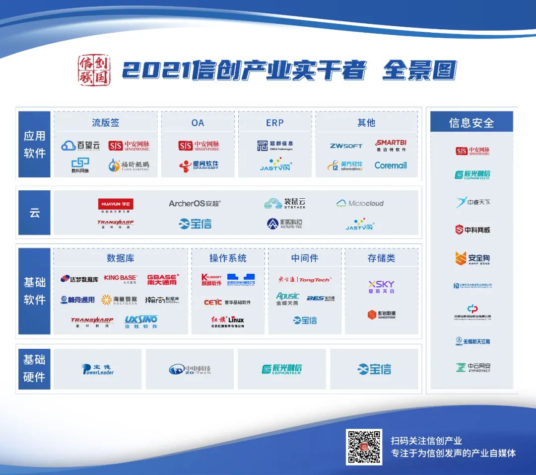 安超云被称为国内的“VMware全替代服务商”,位列计世资讯《国产云操作系统白皮书》领导者象限,致力于用真诚付出,持续打造新型基础设施与服务,成为客户在数字化转型和国产化替换领域最可靠的同行者,助力客户挖掘数字原力,加固起深厚的竞争护城河,信奉行则将至、勤必有成。宝信科技依托深厚国资背景,以“云+端一体化”为切口,率先尝试将智能语音与AI算法应用至智慧屏等终端,形成“AI云脑+智慧屏”独特商业路线。多年持续投入技术研发,基于80%的技术人员占比,为客户提供365*24全天候服务,切实营造沉浸式客户体验。华典大数据是中国科学技术大学先进技术研究院孵化的量子安全数据库厂商。作为量子安全数据库领域的新生势力,持续探索推进量子通信+存储的应用闭环,构建“国产化+量子化”的数据安全治本式解决方案,致力于用量子技术保护每一条数据,目前已实现金融和国防等行业布局。百望云2015年开始涉足信创领域,基于2000+集团企业、200万家成长型企业、1000万家小微企业和3亿C端消费者的数字化服务经验,聚焦国标版式OFD,打造自主创新“票、单、证、文”基础设施,以诚信为基石,强调“快速行动、使命必达”,连续三年被工信部赛迪顾问评测为中国电子发票开具量市场占有率领先。作为早期国产化八大整机厂商之一,宝德具备板卡级别到整机系统的完全自主研发和按需定制能力,提供从台式机、笔记本、一体机、瘦客户机到服务器、存储的丰富类别信创产品,更是业界最早推出计算机整机全模块化产品的厂商。成立20多年来,宝德坚守实干与专注,600多名一线技术工程师随时待命,4h/2h快速响应服务已覆盖58个地区。作为国产基础软件领导者,宝兰德成立10余年以来,坚定探索中间件国产化道路,完成了从中间件产品“一体”,拓展至中间件+智能运维“两翼”的整体化布局,其支撑中国移动相关核心业务系统稳定运行10年以上,并已完成后者20多个省公司核心业务系统的国产化替换,为这一中间件领域国内规模最大的核心系统应用案例,写下出彩的跨时代注脚。辰光融信是国内输入输出产品、解决方案及服务的头部提供商,成功打造以 “立思辰”品牌为核心的外设产品、硬件全生命周期管理解决方案和一站式打印服务闭环体系,近500个专业技术团队覆盖全国市场,稳定服务多个国家部委、高层次行业组织。作为企业信用评价AAA级企业,疫情期间为黄冈市中心医院积极捐赠设备,坚定履行社会责任。东方通是国内首家在A股上市的基础软件厂商,以“安全+”和 “数据+”两大产品体系为基础,依托稳定、可靠支撑和长期主义价值观,在政务、金融、交通、电信等行业树立了众多应用典范。其自主研发的交易中间件TongEASY填补国内技术空白,荣获“国家科技进步二等奖”。后疫情时期,积极复工复产,依托信创在国计民生领域取得突破性进展,实现2020年整体经营业绩较上年同期大幅增长。冠群信息是国内ICT产品研发和服务领域的头部创新型企业,自成立之初就将“质胜”写入经营理念,先后参编20余项电子文件和档案一体化、OFD、电子证照、ERP等行业的国家级标准,拥有军工三证和涉密信息系统集成(甲级)资质。作为率先将国产软件应用输出至纳米比亚等全球多个发展中国家和地区的厂商,冠群信息树立了中国技术、中国体系、中国方案“走出去”的典范。海量数据是国内首家主板上市的数据库技术领航企业。成立14年以来,秉持“专注做好数据库”的初心,其核心研发人员均有10年以上知名跨国公司数据库研发经验,是数据库领域当之无愧的实战派。比对国际标准,全面建立执行严格的研发管理、质量保证、信息安全管理、信息技术服务管理和知识产权管理体系,致力于成为客户长久可靠的数据库领域合作伙伴。红旗软件是国产基础软硬件综合服务领军企业,2016年以金融信创为切入,开启信创领域的探索和实践,逐步实现红旗操作系统+国产芯片金融机具的全面大批量应用,目前已在全国部署超过10万台金融机具,实现红旗银行智能终端操作系统常年保持金融信创细分市场占有率领先。人大金仓是中国电子科技集团成员企业,以“让数据管理更可靠、更便捷、更智能、更融合”为使命,扎实专注数据库领域20余载,具备出色的数据库产品研发及服务能力,是迄今为止数据库领域唯一荣获国家科学技术进步二等奖的企业。作为数据库“国家队”,研发出具有国际先进水平、国内最高安全级别EAL4+的数据库产品,构建了覆盖数据管理全生命周期、全技术栈产品、服务及解决方案体系,服务的触角下沉延伸至全国近3000余个县市。数科网维是国内版式软件行业领军企业,先后承担科技部重大专项等国家级重点科研课题,是国家OFD版式文件格式标准、党政机关电子公文系列标准规范等的深度参编单位,成立15年以来,致力于切实推动OFD在各相关行业的落地实践和深化应用,充分发挥OFD作为我国信息化通用基础标准的作用,保障各行各业重要信息资产的安全可用。优炫软件自成立之初,立志以自主创新攻坚数据库难题,专注打造自主人才梯队,建设高可用、强安全、智能化的数据库产品与生态,稳健高效支撑第七次全国人口普查等国家级重点项目,负责普查全电子化数据采集、处理、分析等工作,超200人专属团队全程参与,最长封闭周期超过200天,依托深厚技术实