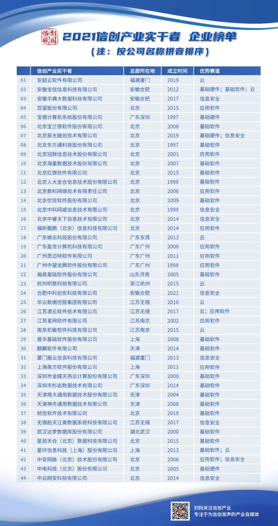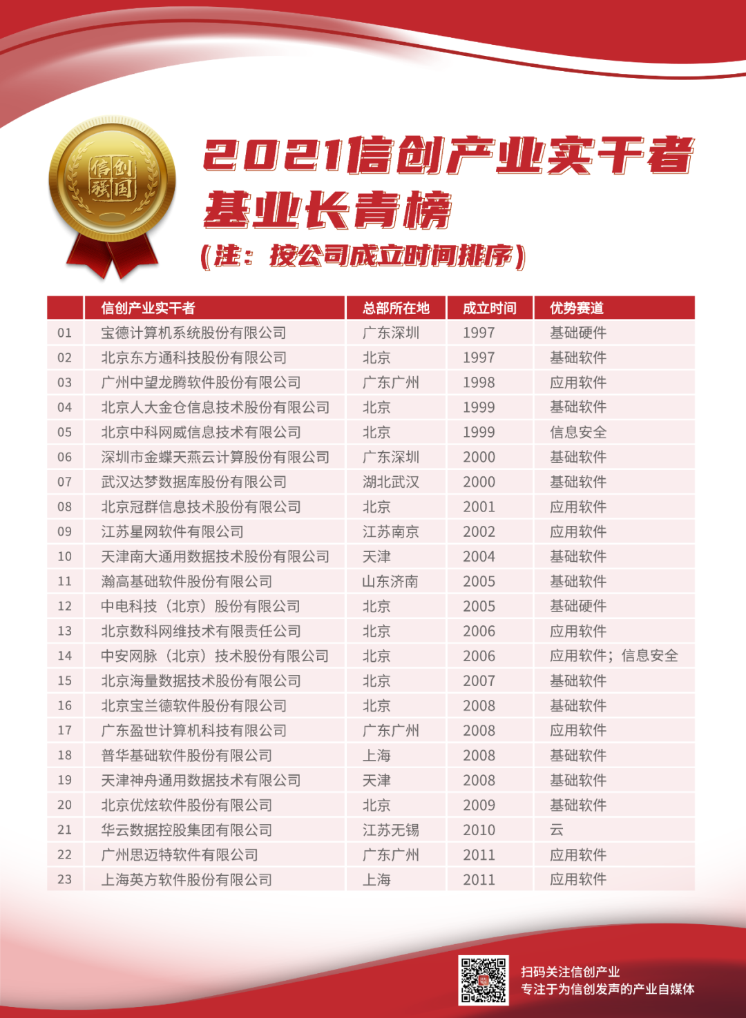 抛掉稍纵即逝的流行概念,卸下连篇累牍的专业术语,实干才是这些信创杰出企业的永恒品质。必须不驰于空想、不骛于虚声,方可使九层之台,起于累土,才成就了一批创立10年以上的基业长青者。守正务实,敢于开拓,躬身入局,不惧硬仗,既是这些杰出企业在过去10余年间成为造钟人而非报时者的经验秘籍,也将是更多信创产业实干者成就下一个10年、20年,甚至开启未来百年大重构与新竞合的战略要义。以下是2021信创产业实干者企业(基业长青榜)盘点结果:蹄疾步稳,江河入海,“实”字当头、“干”字为先。立足“十四五”开局之年,属于信创的黄金时代才刚刚开始。务实深耕作为信创厂商更为宝贵和必要的品质,将助力开启信创产业立柱架梁新征程,化激流为势能,推动中国自主创新之路走得更远一点、更深一点,于高峰处望山海,于众行处共未来。但拥新岁接长筵,不辞最后饮屠苏,祝福2021信创产业实干者们!文章来源:《信创大事件 | 2021信创产业实干者大盘点》