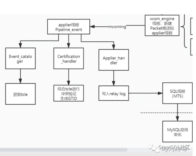 这里的event_cataloger-->certification_handler-->applier_handler 进行的处理就是所谓的applier通道的pipeline。当然如果是本地事务,则不需要写入到relay log,但是其他流程还是需要的。
