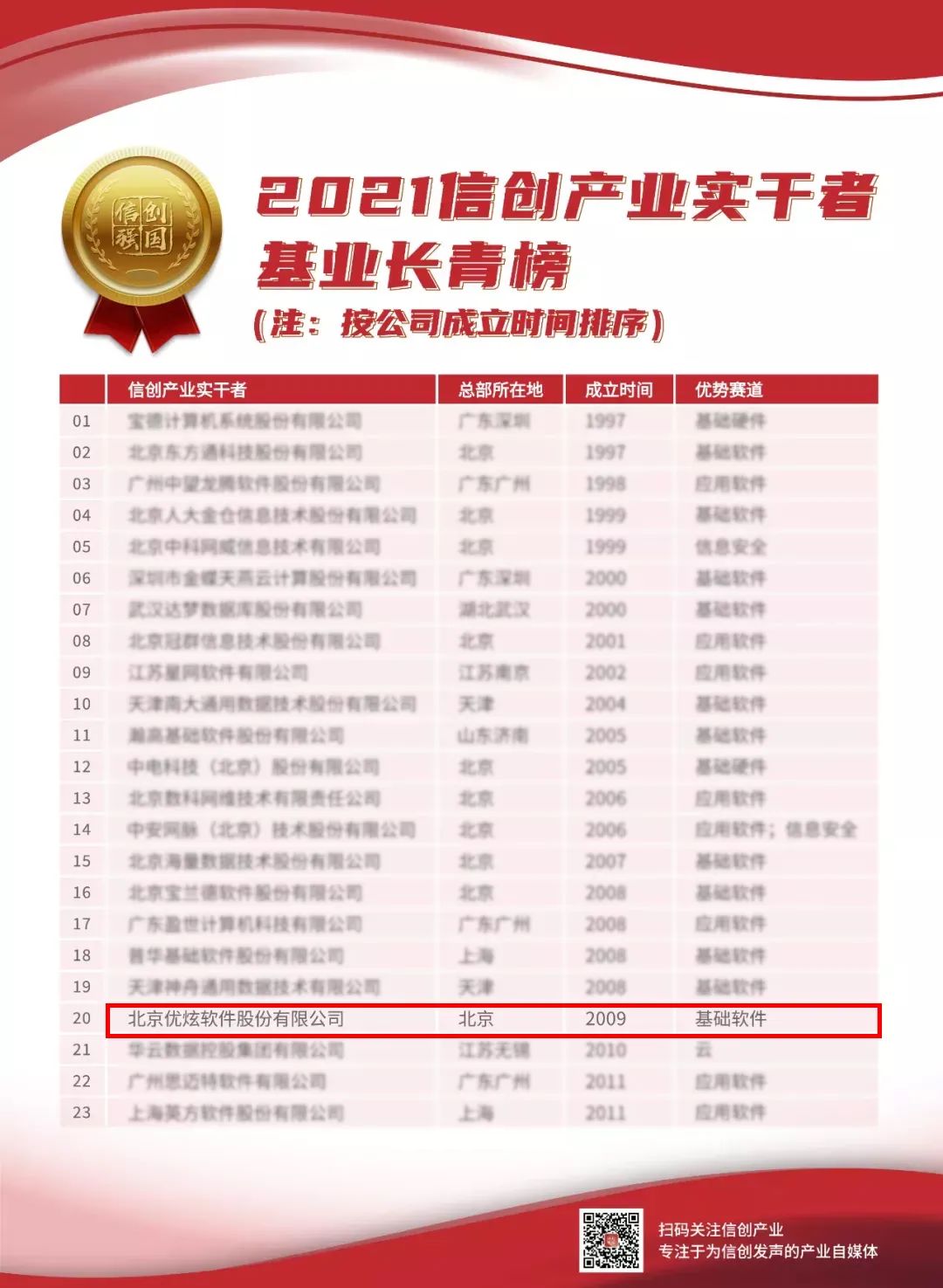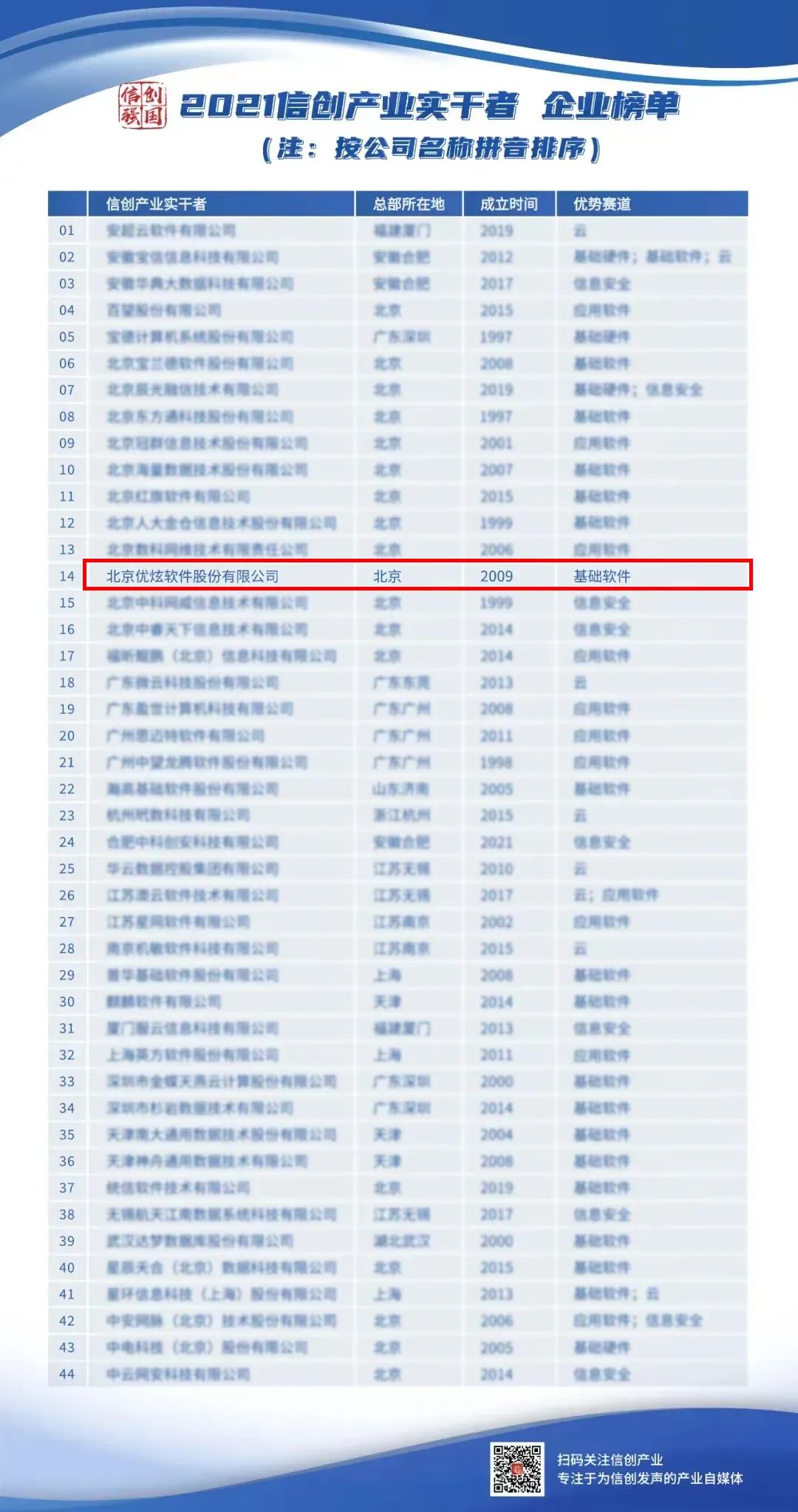 近日,“信创产业”发布“2021信创产业实干者大盘点”,榜单对基础硬件、基础软件、云、应用软件、信息安全等产业链各环节实干企业,进行了一次全面的年终盘点与扫描。优炫软件作为国内主流数据库厂商,以信创数据库领域的综合实力和突出成就,成功入选2021信创产业实干者盘点实干企业和2021信创产业实干者盘点基业长青企业。