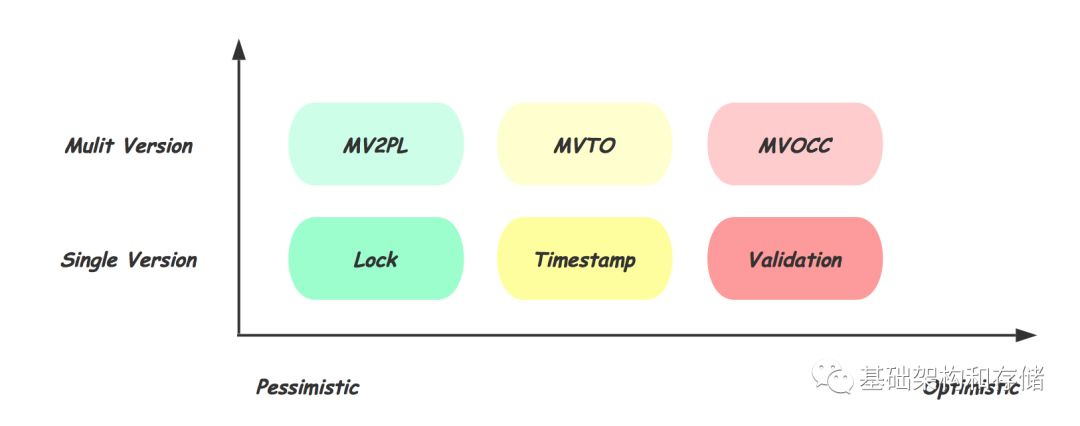 不同的实现机制,基于不同的对发生冲突概率的假设,悲观方式认为只要两个事务访问相同的数据库对象,就一定会发生冲突,因而应该尽早阻止;而乐观的方式认为,冲突发生的概率不大,因此会延后处理冲突的时机。如上图横坐标所示,乐观程度从左向右增高: