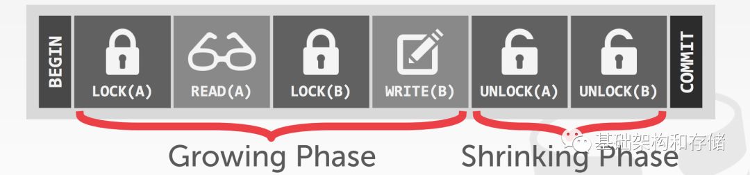 基于Lock实现的Scheduler需要在事务访问数据前加上必要的锁保护,为了提高并发,会根据实际访问情况分配不同模式的锁,常见的有读写锁,更新锁等。最简单地,需要长期持有锁到事务结束,为了尽可能的在保证正确性的基础上提高并行度,数据库中常用的加锁方式称为两阶段锁(2PL),Growing阶段可以申请加锁,Shrinking阶段只能释放,即在第一次释放锁之后不能再有任何加锁请求。需要注意的是2PL并不能解决死锁的问题,因此还需要有死锁检测及处理的机制,通常是选择死锁的事务进行Abort。