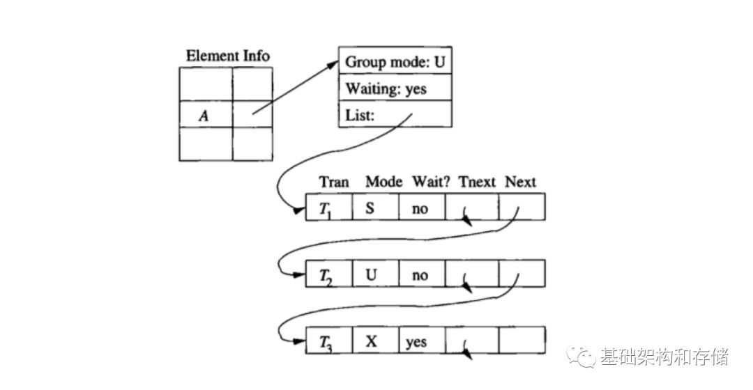 Scheduler对冲突的判断还需要配合Lock Table,如下图所示是一个可能得Lock Table信息示意,每一个被访问的数据库对象都会在Lock Table中有对应的表项,其中记录了当前最高的持有锁的模式、是否有事务在Delay、以及持有或等待对应锁的事务链表;同时对链表中的每个事务记录其事务ID,请求锁的模式以及是否已经持有该锁。Scheduler会在加锁请求到来时,通过查找Lock Table判断能否加锁或是Delay,如果Delay需要插入到链表中。对应的当事务Commit或Abort后需要对其持有的锁进行释放,并按照不同的策略唤醒等待队列中Delay的事务。