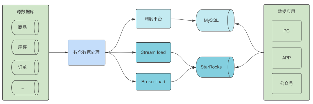 商品、库存、订单等系统产生的源数据信息落库在 MySQL,经由数仓抽数后进行一系列加工处理,将计算好的结构化数据存储在统一的数据仓库中,根据数据的特点,我们使用了 MySQL 和 StarRocks 数据库并存的方式进行数据存储。集群会根据数据的不同特征采取不同的推送方式,实时数据使用 stream load、离线数据使用 broker load,结合我们自研的调度平台等多种方式进行数据推送, StarRocks 现阶段存储数据量整体占比估算为80%+,未来 StarRocks 也会作为我们数据应用层最主要的存储引擎,将充分利用 StarRocks 的向量化及物化视图等技术,支撑数据中台数据量的快速增长。
