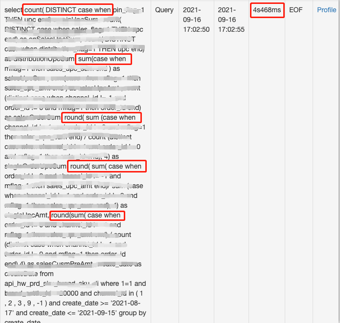 在执行计划中可以看到 SQL 耗时为 4s468ms,性能非常低,是不可以接受的。分析原因是 SQL 中包含多个 case when 语句,数据要从表中查询出来,在通过 case when 指定的条件进行过滤,在分布式的场景下,数据在多机之间传递,非常消耗性能。