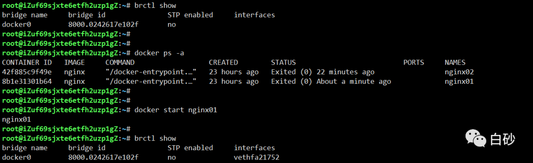 这样类似的名字命名,并将这个网络设备加入到 docker0 网桥中。