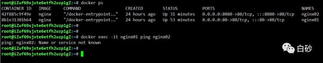 启动两个容器,通过名称ping,结果是不通的。