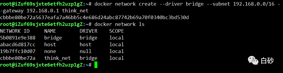 root@iZuf69sjxte6etfh2uzp1gZ:~# docker network create --driver bridge --subnet 192.168.0.0/16 --gateway 192.168.0.1 think_net