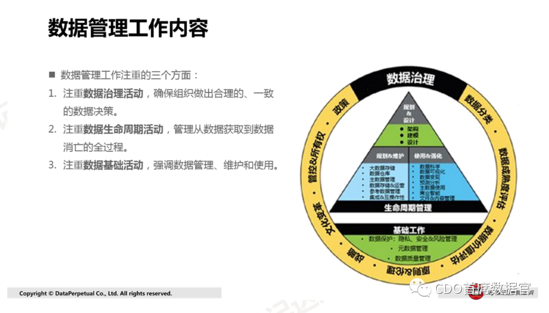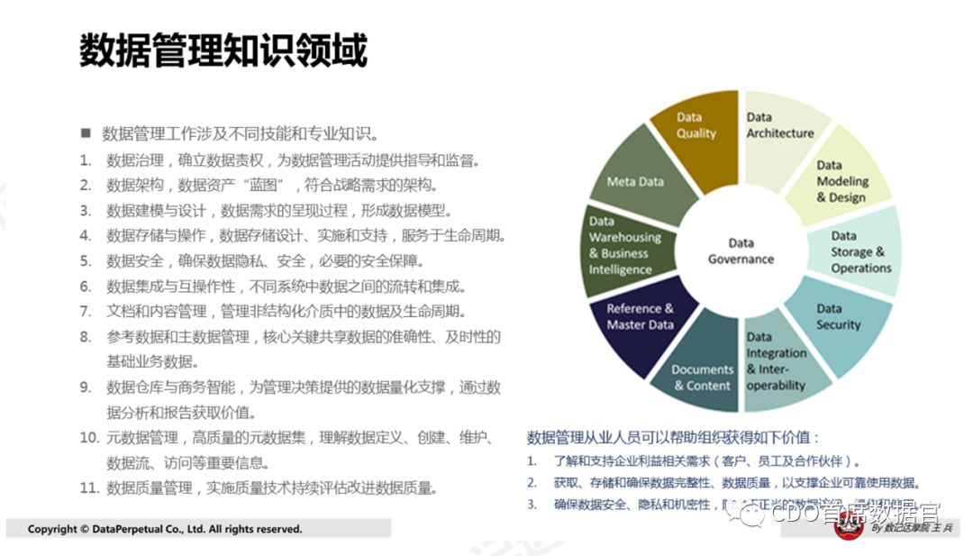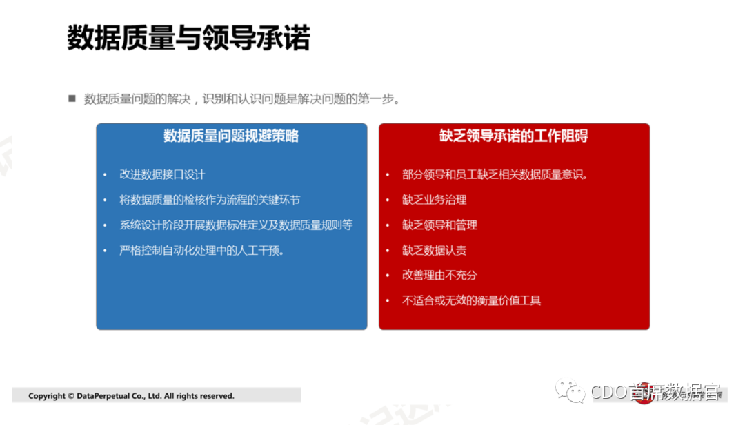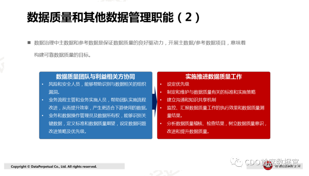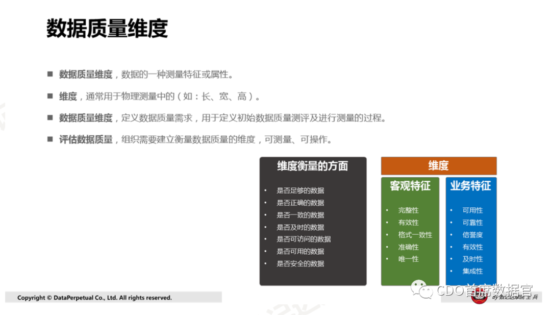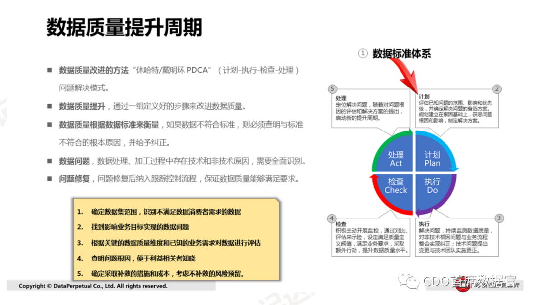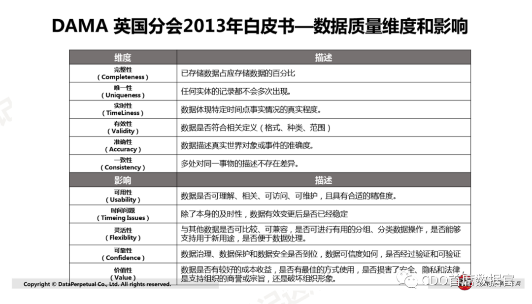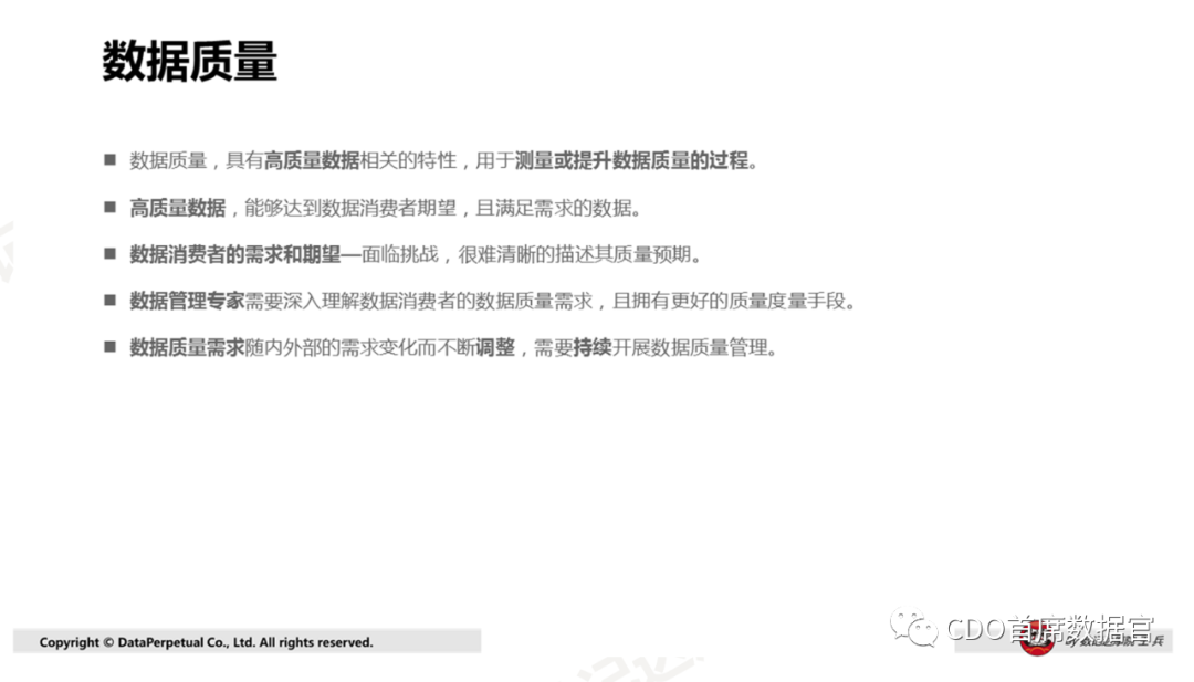 数据质量管理主要解决“数据质量现状如何,谁来改进,如何提高,怎样考核”的问题。在关系型数据库时代,做数据治理最主要的目的是提升数据质量,让报表、分析、应用更加准确。