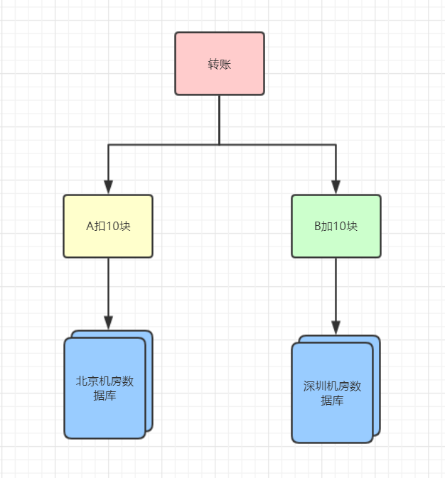 比如 A 转 10 块给 B,A 的账户数据是在北京机房,B 的账户数据是在深圳机房。