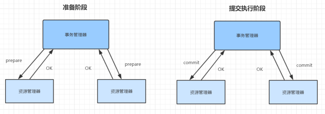 准备阶段,事务管理器向每个资源管理器发送准备消息,如果资源管理器的本地事务操作执行成功,则返回成功,如果执行失败,则返回失败。