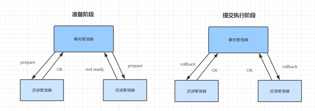 提交执行阶段,如果事务管理器收到了任何一个资源管理器失败的消息,则向每个资源管理器发送回滚消息。