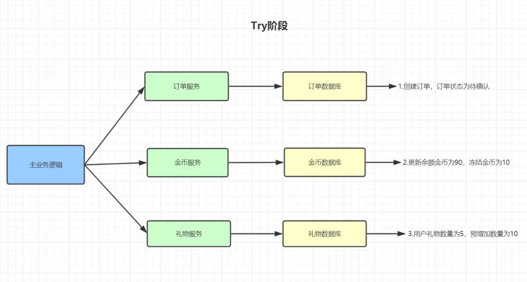 Try 阶段:尝试去执行,完成所有业务的一致性检查,预留必须的业务资源。