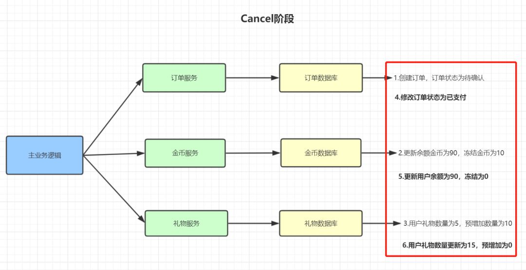 Cancel 阶段:若业务执行失败,则进入该阶段,它会释放 Try 阶段占用的所有业务资源,并回滚 Confirm 阶段执行的所有操作。