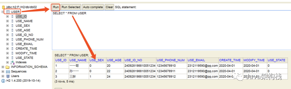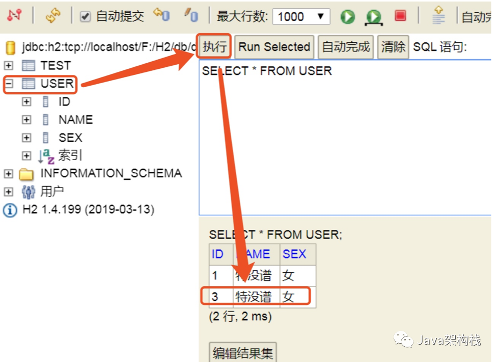进入到H2的web控制台,可以在Web控制台中看到插入了一个新的数据。