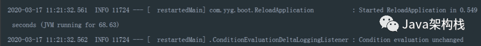 接着我们随便修改一下Java类中的内容,在正常情况下,就会发现代码修改后,我们的IDE控制台就会输出如下内容,表示我们的项目正在进行自动重启。