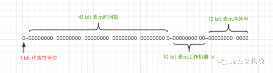 其中1个bit是不用的,然后用其中的41 bit作为毫秒数,用10 bit作为工作机器id,12 bit作为序列号。