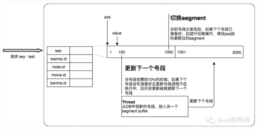 这样DB取号段的过程能够做到无阻塞,不需要在DB取号段的时候阻塞请求线程,即当号段消费到某个点时就异步的把下一个号段加载到内存中。而不需要等到号段用尽的时候才去更新号段。